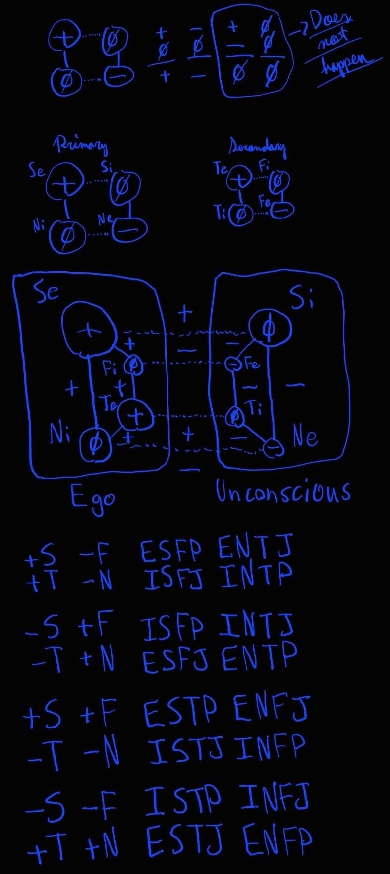 A positive function cannot be connected directly to a negative one, as that would create a “short” in the “circuit”. However, information/energy can flow between positive and negative functions via the neutral intermediary functions, using cognitive axis and orbit.